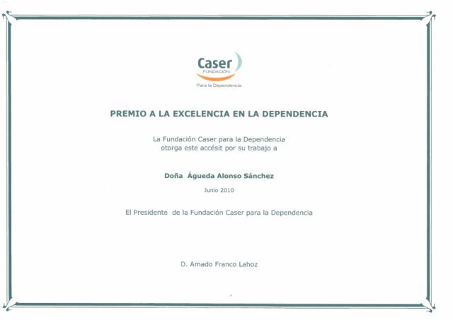 En la categoría de Premio a la Excelencia en Dependencia que se otorga a la persona, empresa o entidad que se haya destacado por el desarrollo de iniciativas o trabajos que hayan contribuido a dar soluciones integrales a los problemas derivados de la dependencia, considerando todos los aspectos de la misma, ya sean de índole económica, normativa, de garantía de equidad o cualquier otro que condicione la vida del dependiente, Dña. Águeda Alonso Sánchez fue la ganadora del accésit por su incansable labor al frente de la Asociación Española de Esclerosis Múltiple (AEDEM-COCEMFE) durante un total de 13 años, 3 años como Secretaria General y 9 años como Presidenta, en los que se ha logrado un significativo avance en la atención a los enfermos de Esclerosis Múltiple y sus familias, así como en la sensibilización de la sociedad sobre la problemática de esta enfermedad.