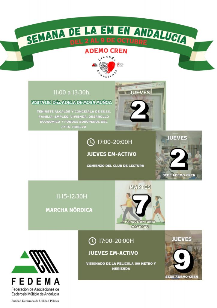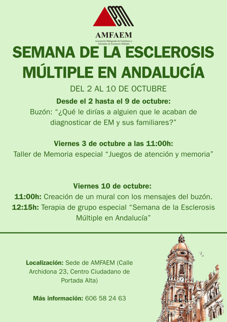 – Viernes 10 de octubre: a las 11h Creación de un mural con los mensajes del buzón y a las 12:15h Terapia de Grupo Especial “Semana de la EM en Andalucía”.