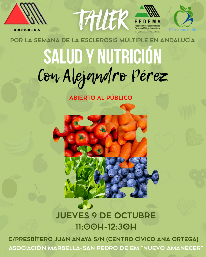 - Jueves 9 de octubre, de 11:00 a 12:30h, Taller de nutrición con Alejandro Pérez, AMPEMNA, C/ Presbítero Juan Anaya, s/n (Centro Cívico Ana Ortega).