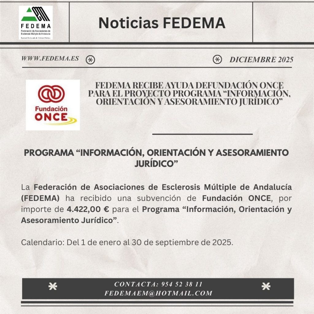 La Federación de Asociaciones de Esclerosis Múltiple de Andalucía (FEDEMA) ha recibido una subvención de Fundación ONCE, por importe de 4.422,00 € para el Programa “Información, Orientación y Asesoramiento Jurídico”.