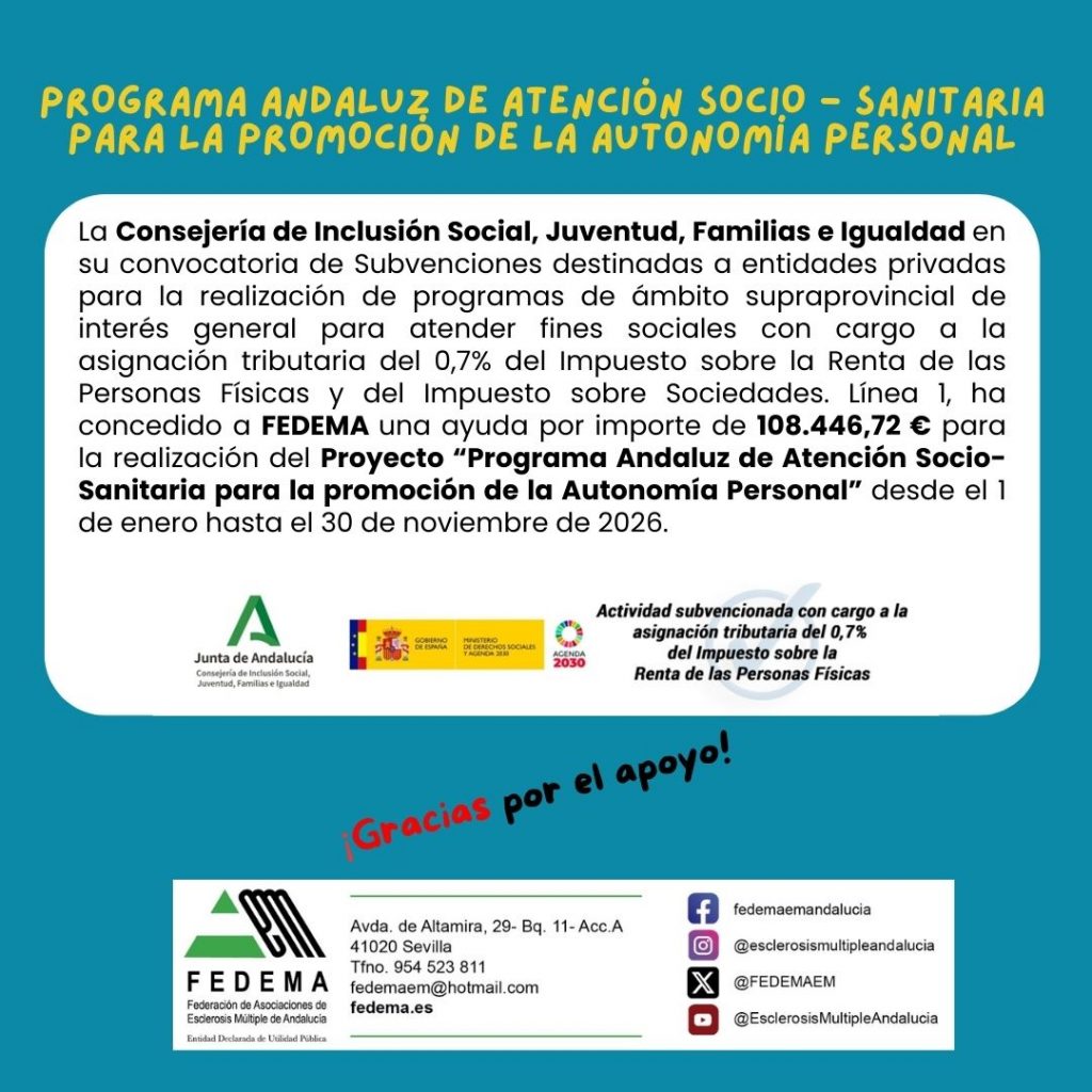 La Consejería de Inclusión Social, Juventud, Familias e Igualdad en su convocatoria de Subvenciones destinadas a entidades privadas para la realización de programas de ámbito supraprovincial de interés general para atender fines sociales con cargo a la asignación tributaria del 0,7% del Impuesto sobre la Renta de las Personas Físicas y del Impuesto sobre Sociedades. Línea 1, ha concedido a FEDEMA una ayuda por importe de 108.446,72 € para la realización del Proyecto “Programa Andaluz de Atención Socio- Sanitaria para la promoción de la Autonomía Personal” desde el 1 de enero hasta el 30 de noviembre de 2026.