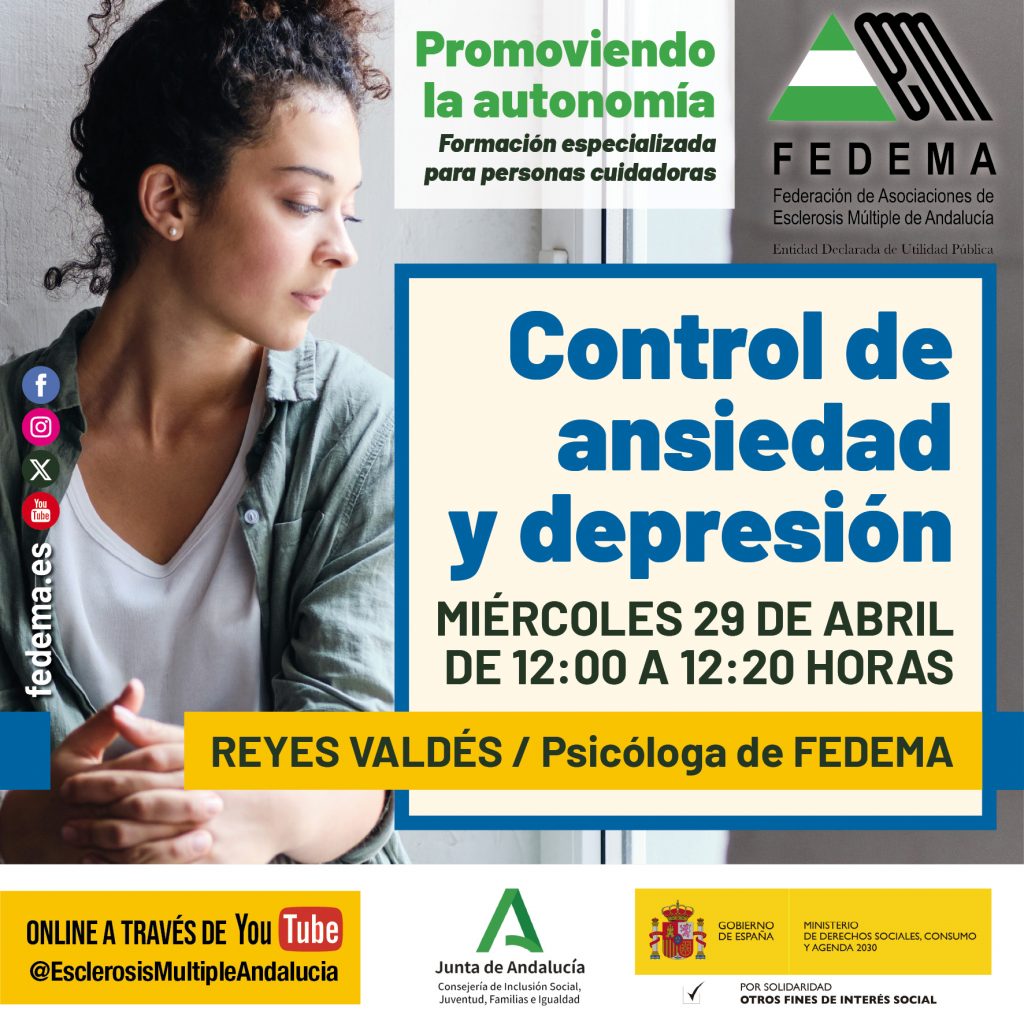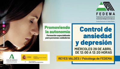 Este mes, en el programa de “Promoviendo la Autonomía”, el 29 de abril de 12:00 a 12:20 h, a través de nuestro canal de YouTube, Reyes Valdés (psicóloga), nos hablará sobre el «CONTROL DE ANSIEDAD Y DEPRESIÓN».